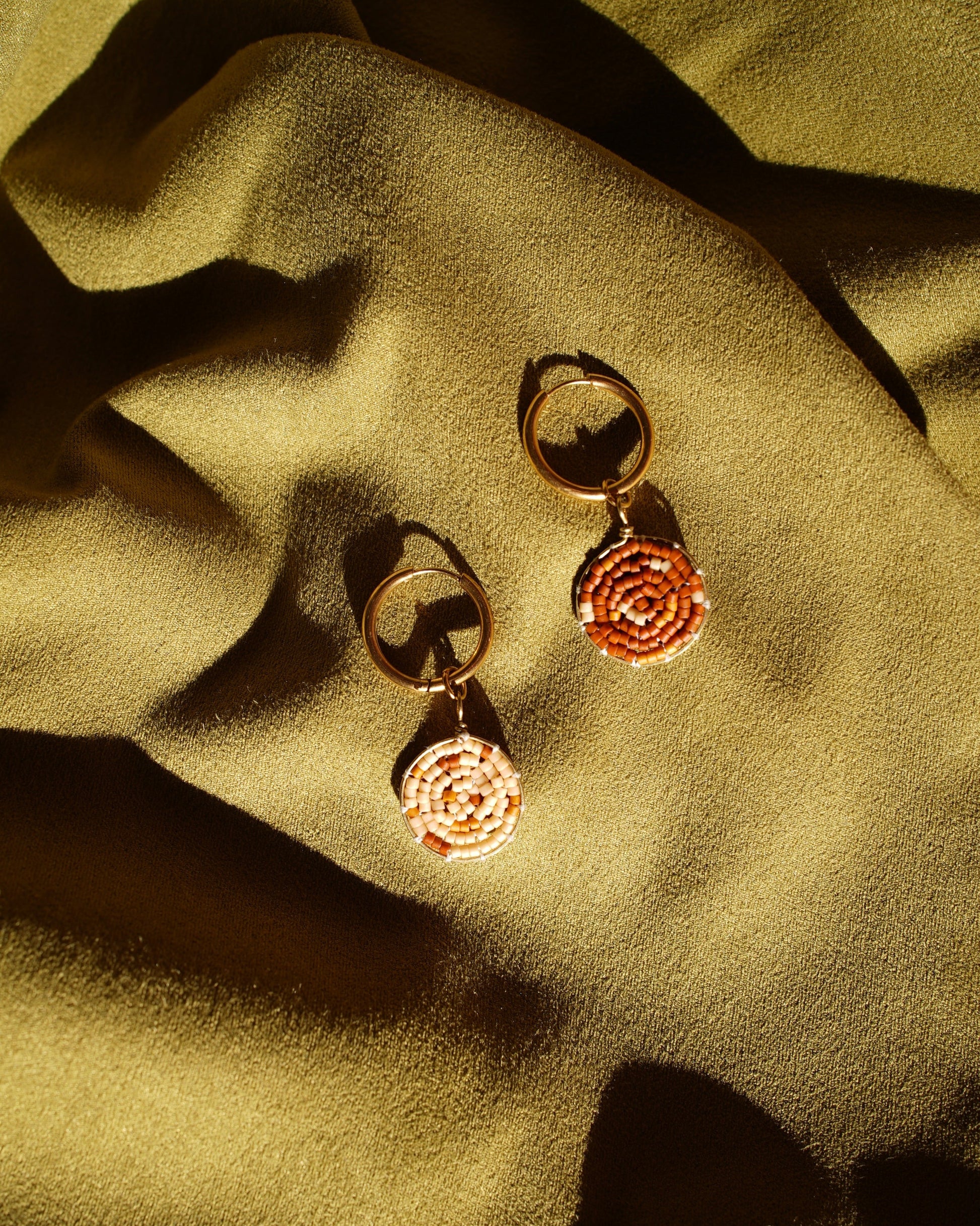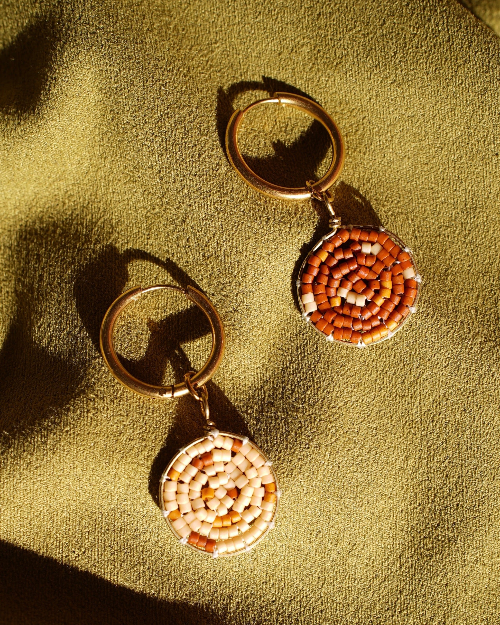 Piccoli cerchi placcati in oro 18K con pendenti modellati e tessuti a mano con filo di ottone e perline di vetro giapponesi.