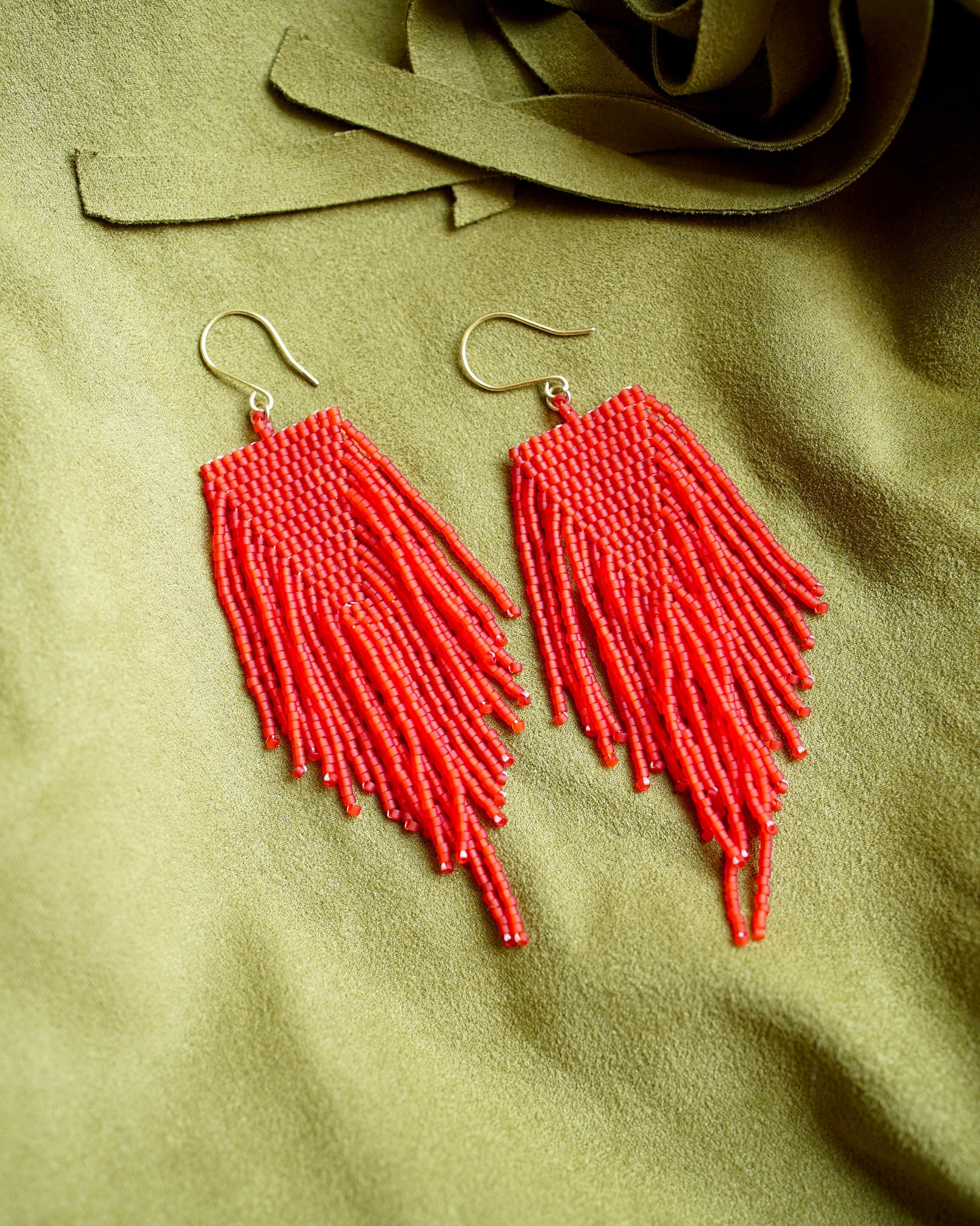 Orecchini tessuti a mano con ago, filo ricoperto in cera d'api naturale, perline di vetro giapponesi. Chiusura modellata a mano in filo di ottone o oro antico 14K.