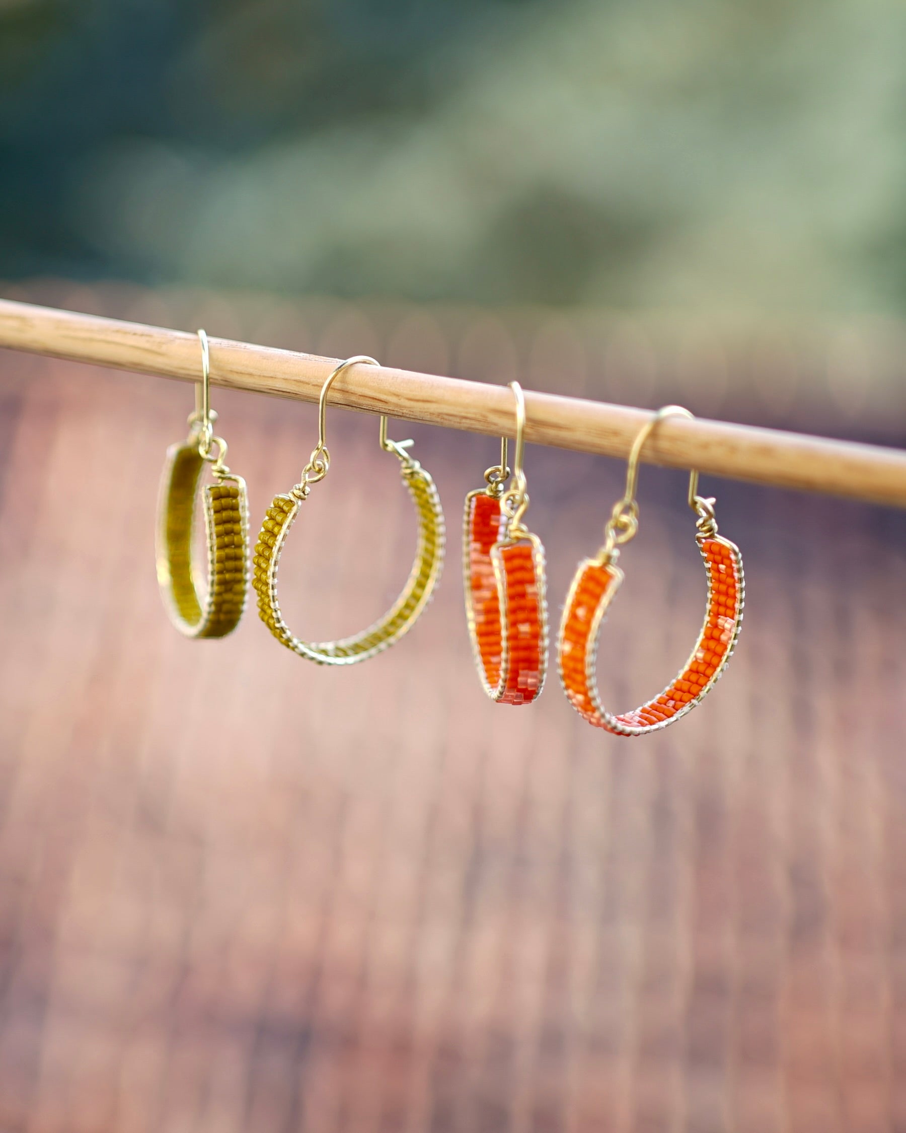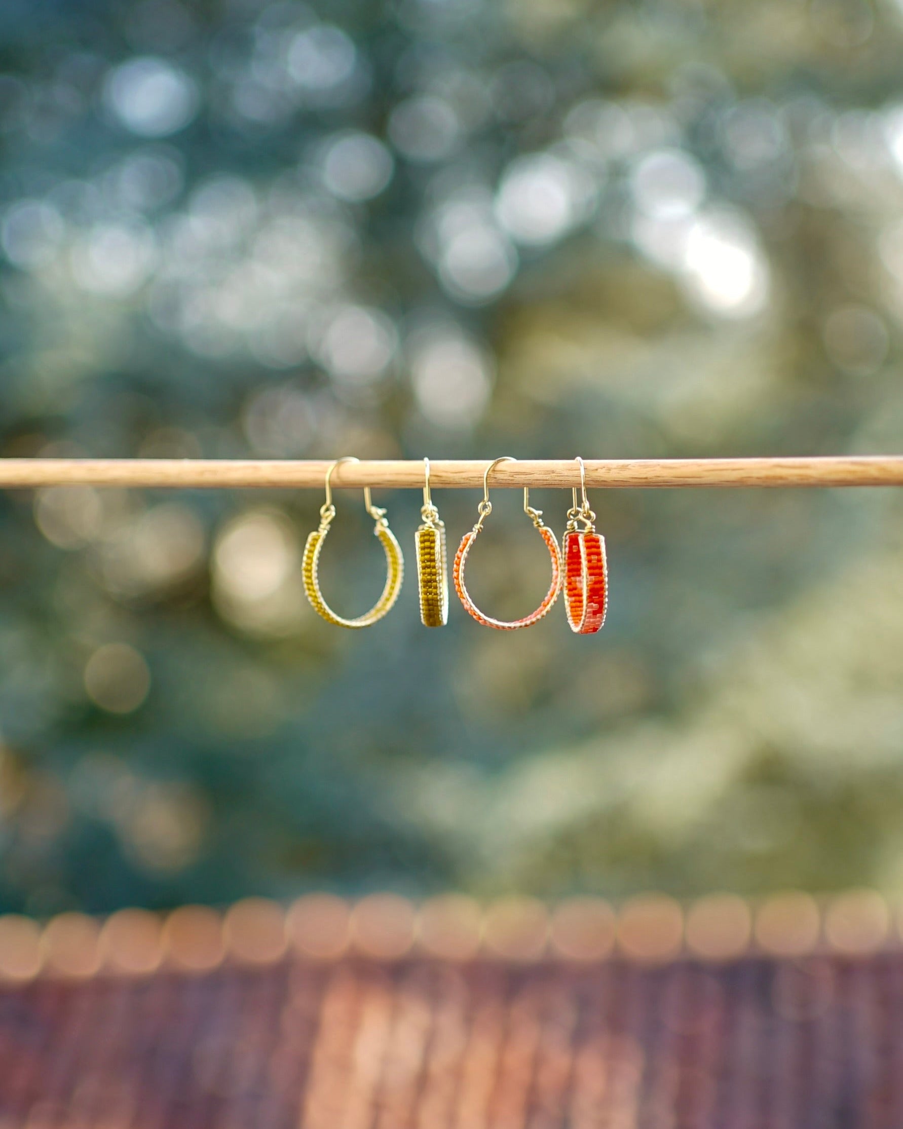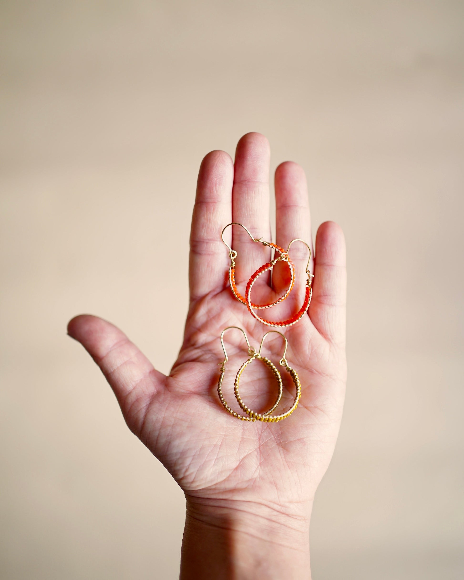 Orecchini pendenti a cerchio modellati, battuti e intessuti a mano con perline di vetro giapponesi e filo di ottone o oro antico a scelta.