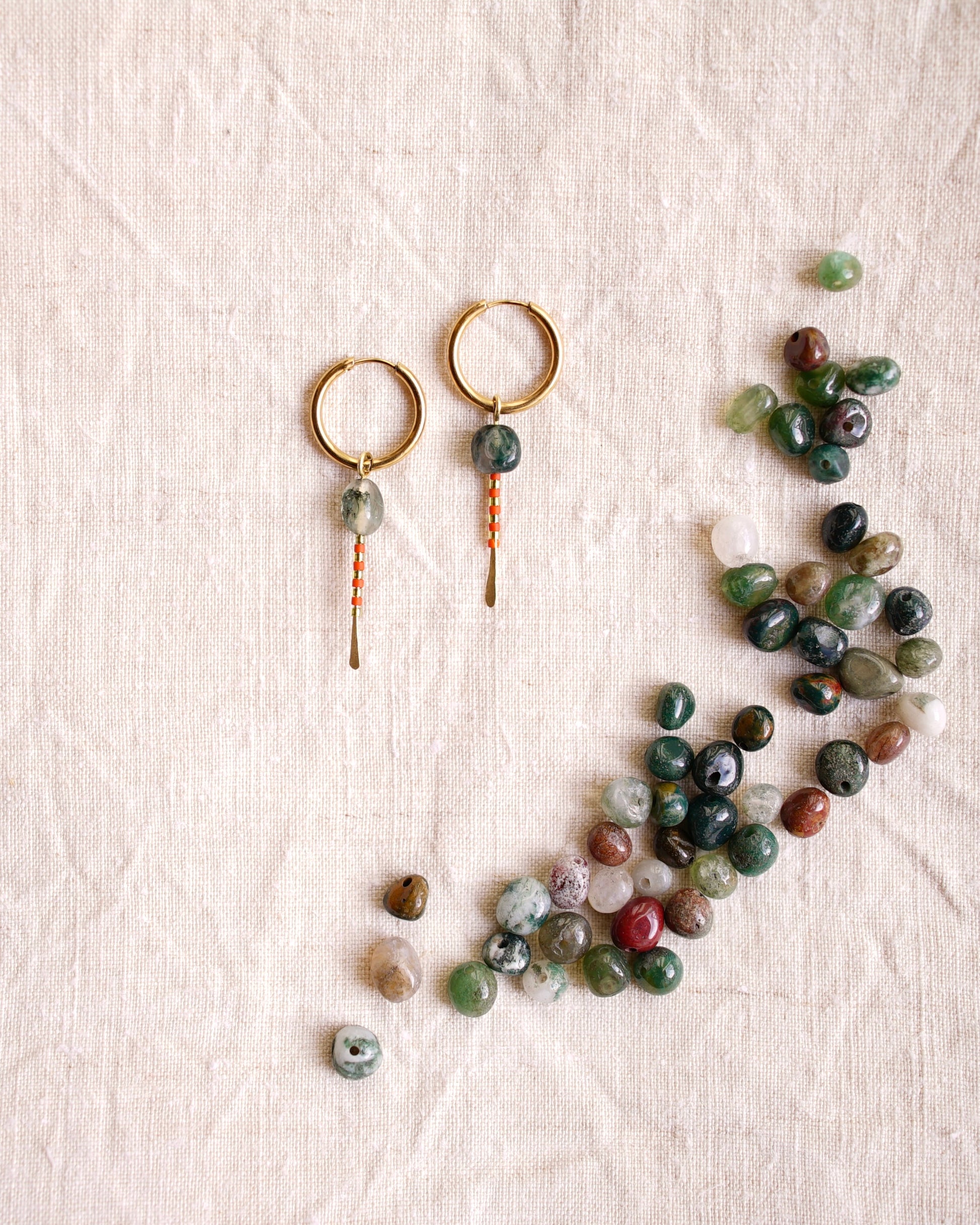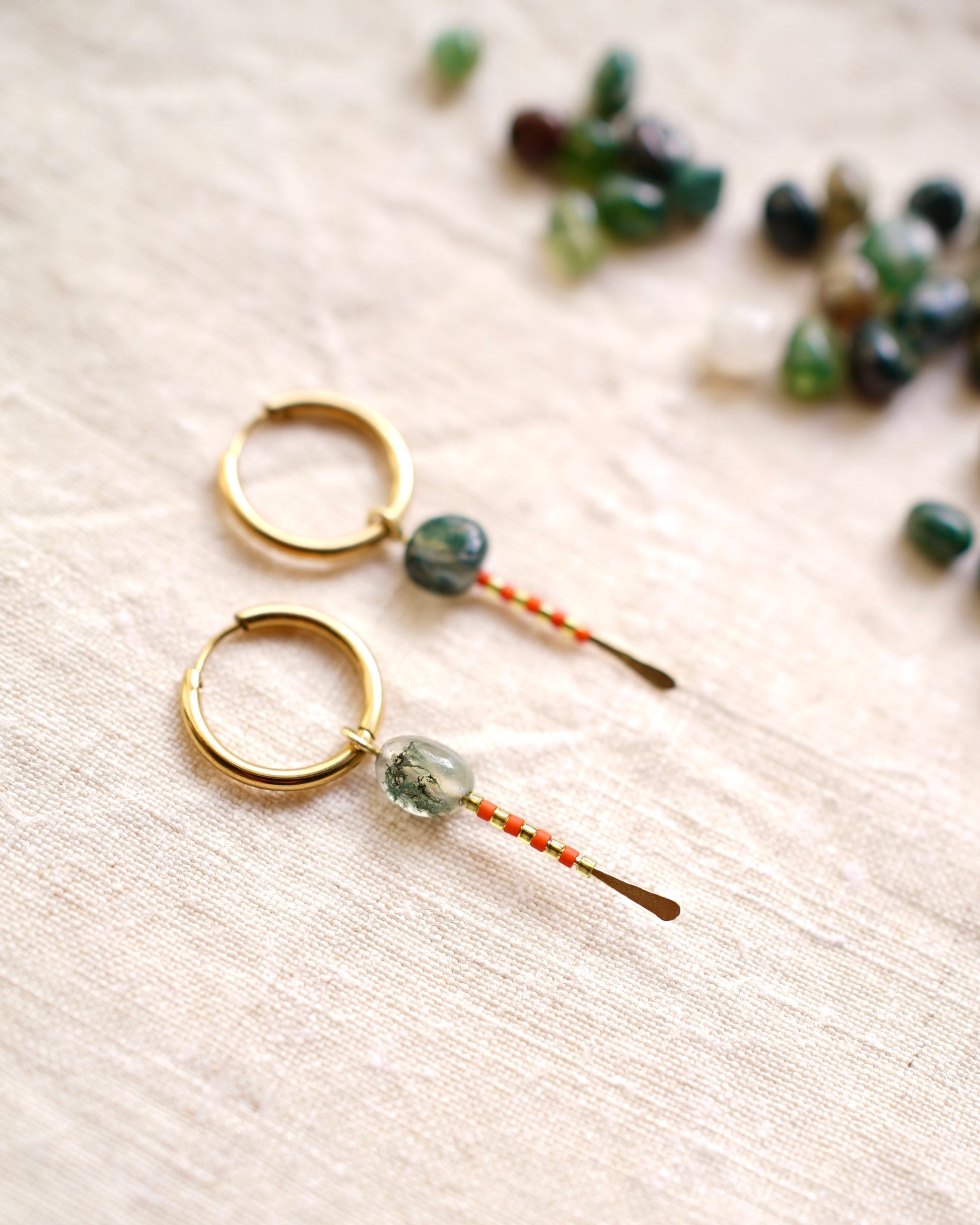 Piccoli cerchi placcati oro 18K con pendenti a raggio fatti a mano in giada muschiata e perline di vetro giapponesi.