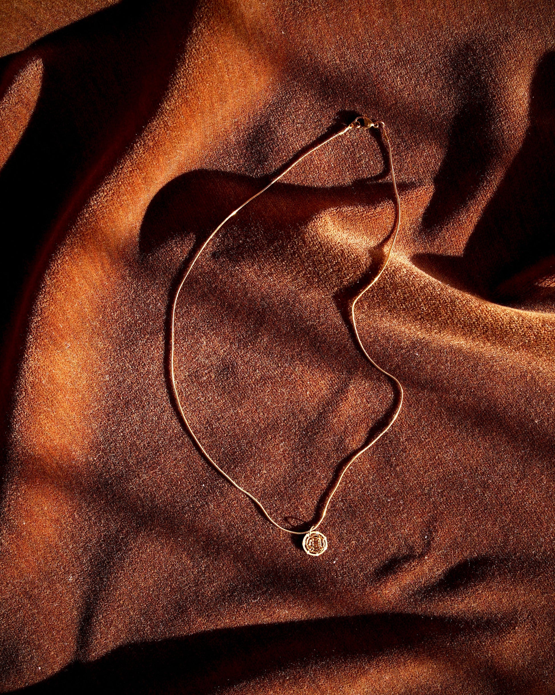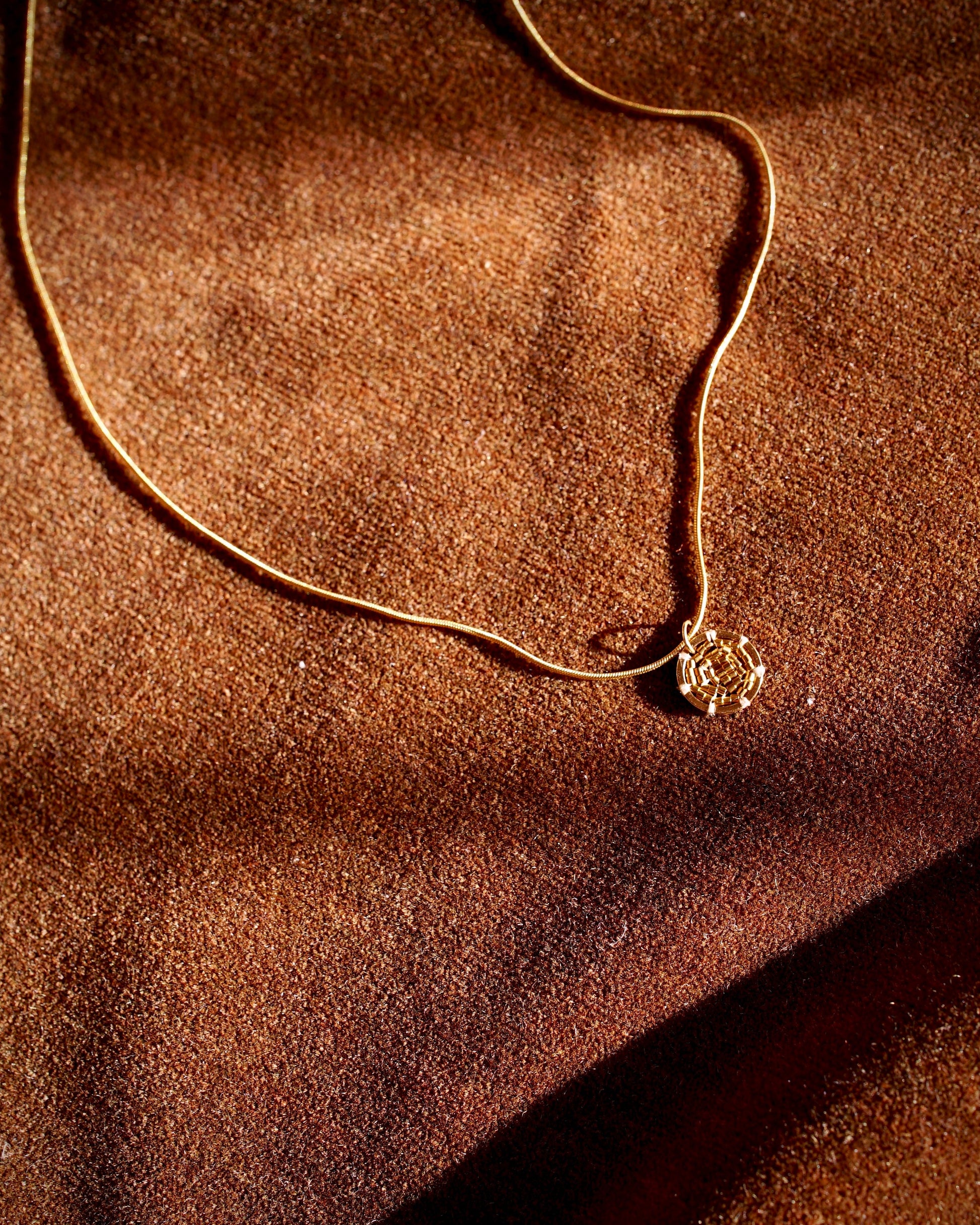 Collana fatta a mano con catenina e chiusure in acciaio inossidabile placcato oro 24K e ciondolo tessuto a mano con ago, filo e perline di vetro placcate oro 24K.