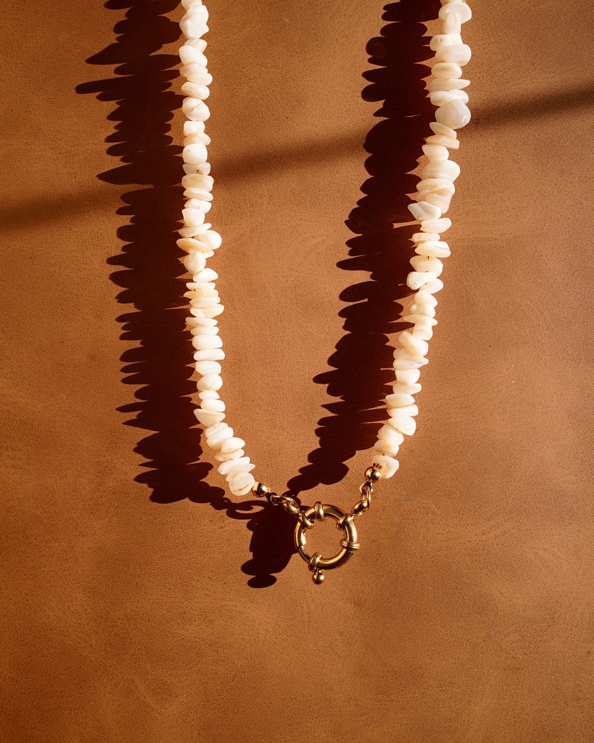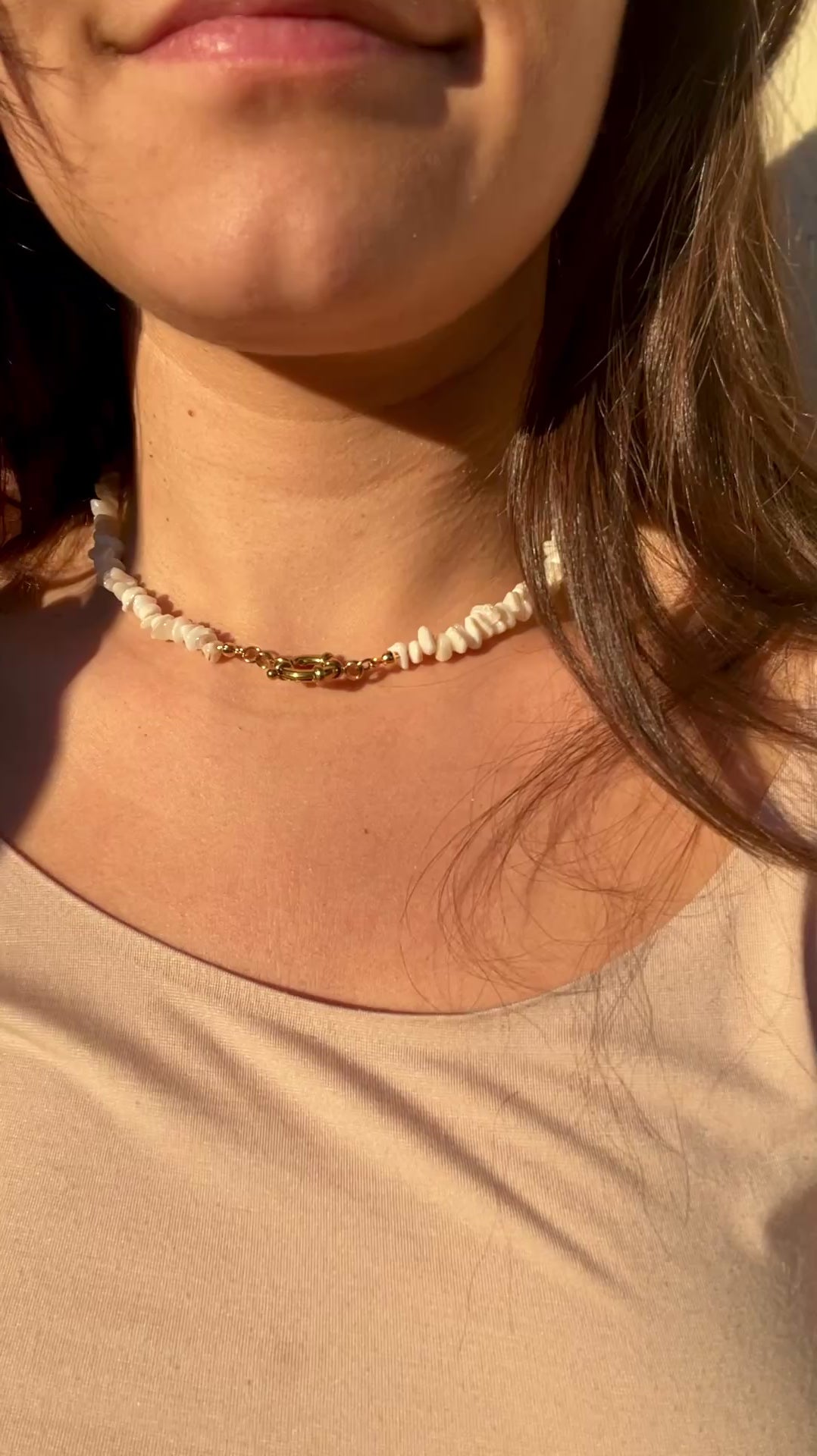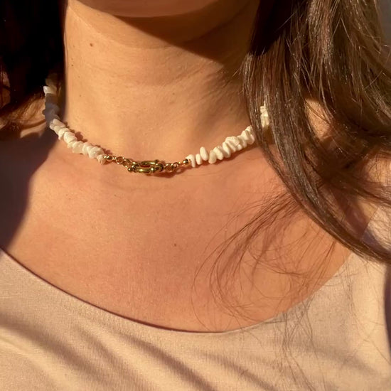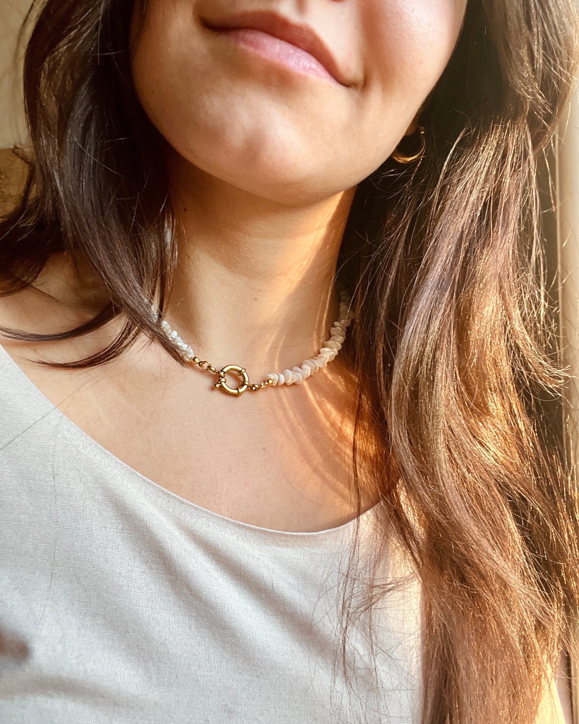 Collana girocollo realizzata a mano con frammenti di madreperla e chiusura a dettaglio placcata in oro 24K.